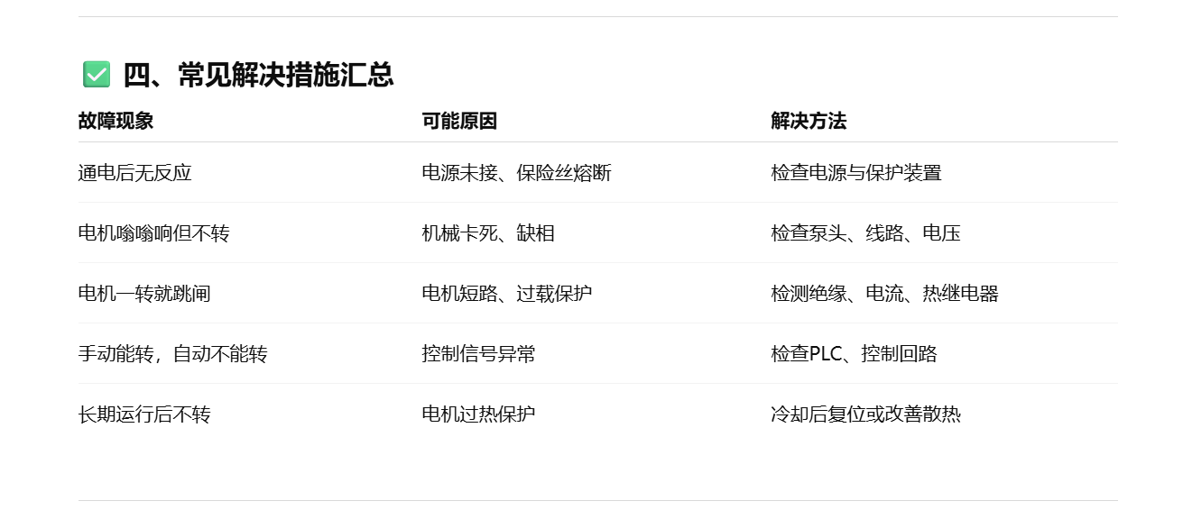• 原因:控制回路接线松动、控制器损坏、启动按钮接触不良。